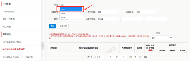 点击左侧导航栏-往年院校投档及录取情况,共显示前三年的院校投档及录取情况,默认显示上一年的院校投档及录取情况,点击左上角的年份,可以切换不同年份。比如,年份选择2021。