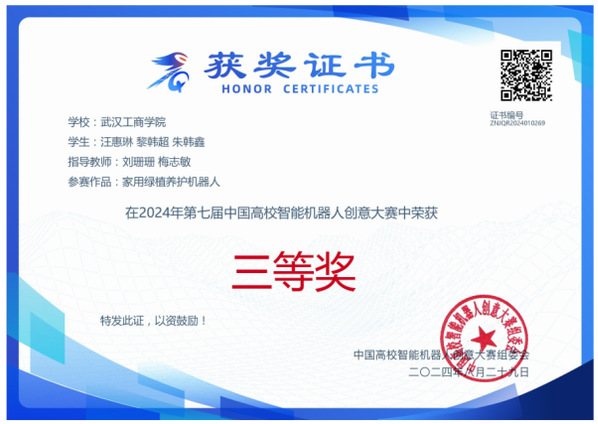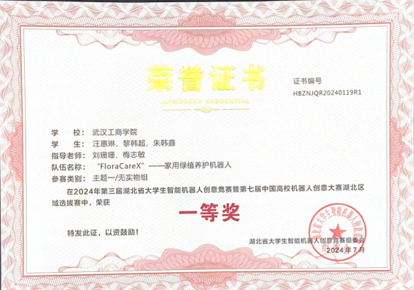 得知获奖消息后,计算机与自动化学院2023级机器人工程专业学生、“FloraCareX”组和“一点小六”组成员黎韩超分享道,“我和队友们都无比激动,特别感谢指导老师在备赛过程中的悉心指导、队友们的鼓励。此次比赛,我负责两支队伍的建模工作和现场答辩任务,时间紧,任务重,在备赛阶段我珍惜每一分每一秒,遇到技术难题时,就向指导老师请教或者和团队成员一起探讨。今后,我将以这份荣誉激励自己,继续努力,争取在专业学习、学科竞赛上交出更满意的答卷。”