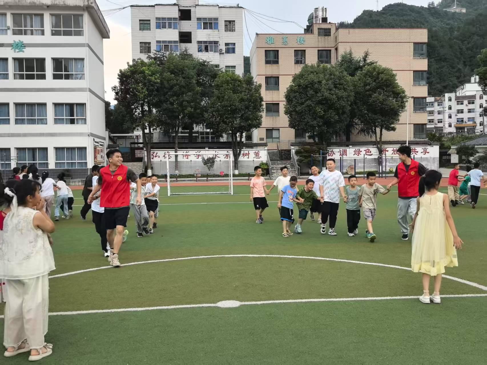 下午的阳光透过小朋友,在操场上投下光影,志愿者们带着小朋友们做起了 “手牵手接力” 小游戏。孩子们立刻兴奋地拉起身边伙伴的手,排成几列歪歪扭扭的小队伍,有的小朋友还紧张地攥紧了同伴的手,准备开始接力跑。志愿者和大家齐声喊着 “加油”,小小的队伍里顿时充满了朝气。最后,所有小朋友都完成了接力,志愿者们笑着和孩子们击掌,操场里满是清脆的笑声和此起彼伏的欢呼,连空气里都飘着甜甜的快乐。
