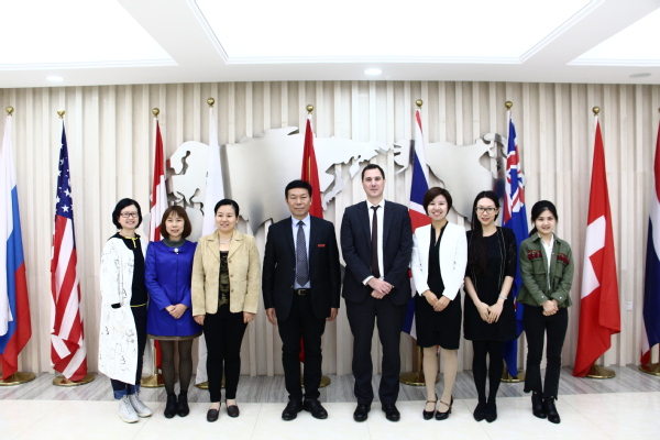新闻中心讯(见习记者 杨盛 顾晴阳 柯念慈 周豪)10月16日上午9:30,英国北安普顿大学市场与国际事务部主任马修·海恩斯,中国代表处招生代表吴倩琳来开云kaiyun官网考察交流。学校党委书记陈伟,国际合作交流处处长孔少敏,经济与商务外语学院常务副院长张晓骏,文法学院党总支书记陈敏等在国际会议厅热情接待了来访嘉宾。会议由孔少敏处长主持。