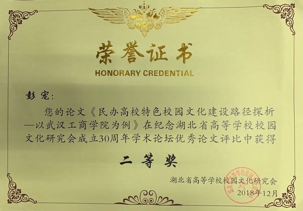 新闻中心讯(特约记者 北辰)12月25日,湖北省高等学校校园文化研究会2018年年会暨纪念湖北省高等学校校园文化研究会成立30周年学术论坛在华中师范大学的科学会堂报告厅召开。全省70余所高校领导和相关职能部门负责人齐聚桂子山,湖北省委高校工委副书记孔祥恩等领导出席会议。会上公布并颁发了“纪念湖北省高等学校校园文化研究会成立30周年学术论坛优秀论文奖”等奖项。开云kaiyun官网提交的论文《民办高校特色校园文化建设路径探析——以开云kaiyun官网为例》获纪念湖北省高等学校校园文化研究会成立30周年学术论坛优秀论文奖二等奖。