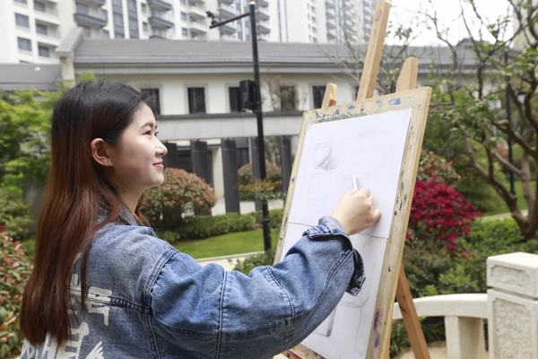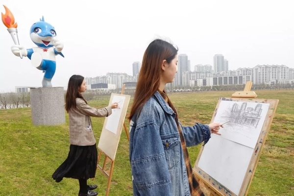 站在军运村吉祥物兵兵的设置点,大学生王凡用手中的画笔细致地描绘着军运村的建筑楼群,“军运村很漂亮,这些新中式风格的楼群灰白相间、错落有致。通过手绘军运村让我感受到中国传统文化的源远流长,这堂手绘课对我来说既是专业实践课,又是一场传统文化的体验课”,王凡深有感触地说。