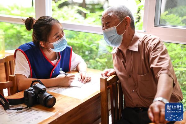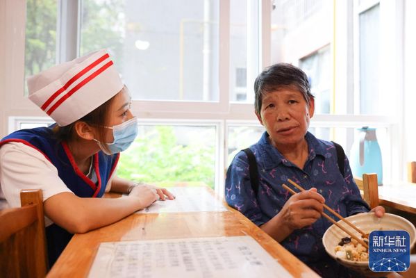 ↑6月27日,佘娅(左)在贵阳诚善助老互助餐厅红岩东郡店内采访老人。