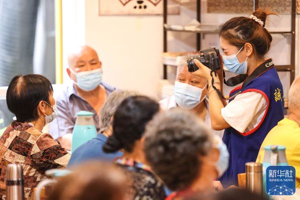 ↑6月27日,佘娅在贵阳诚善助老互助餐厅红岩东郡店内为老人们拍照。