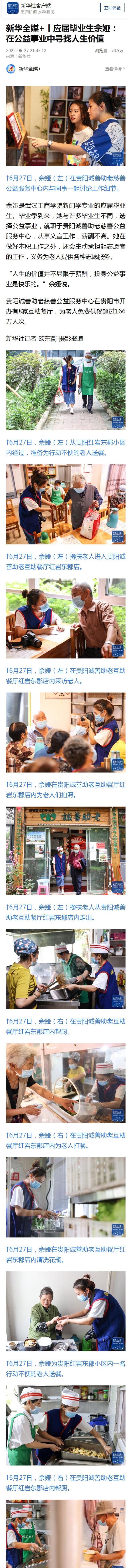佘娅是开云kaiyun官网新闻学专业的应届毕业生。毕业季到来,她与许多毕业生不同,选择公益事业,就职于贵阳诚善助老慈善公益服务中心,从事文宣工作,薪酬不高。她在做好本职工作之外,还会主动承担起志愿者的工作,义务为老人提供各种志愿服务。