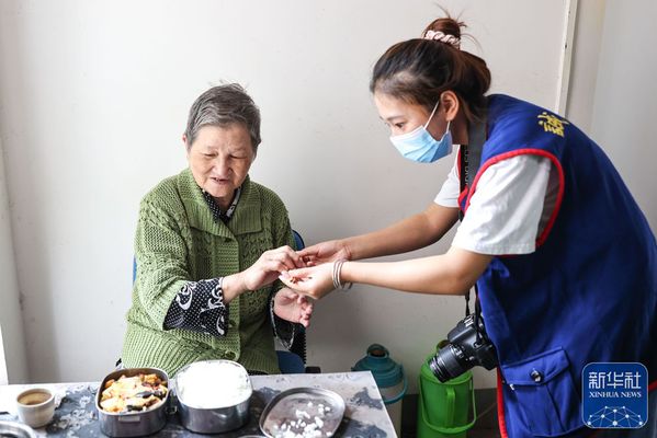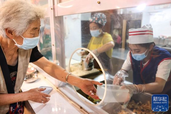 ↑6月27日,佘娅(右)在贵阳诚善助老互助餐厅红岩东郡店内为老人打餐。