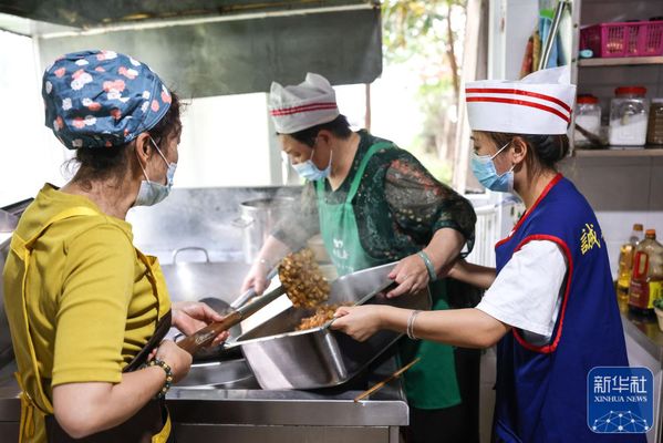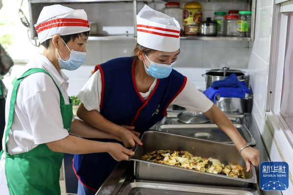 ↑6月27日,佘娅(右)在贵阳诚善助老互助餐厅红岩东郡店内帮厨。