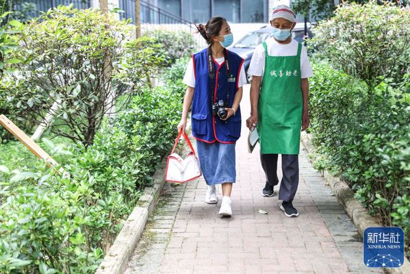 ↑6月27日,佘娅(左)从贵阳红岩东郡小区内经过,准备为行动不便的老人送餐。