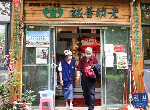 ↑6月27日,佘娅(左)搀扶老人从贵阳诚善助老互助餐厅红岩东郡店内走出。