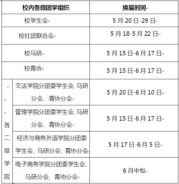 为深入贯彻党的十八届四中全会精神,全面落实党的教育方针,我校积极改进美育德教学,进一步推进素质教育,优化团学组织结构,提高全校团学干部队伍的整体素质。在校团委的直接指导下,现将我校各级团学组织换届时间安排通知如下: