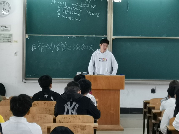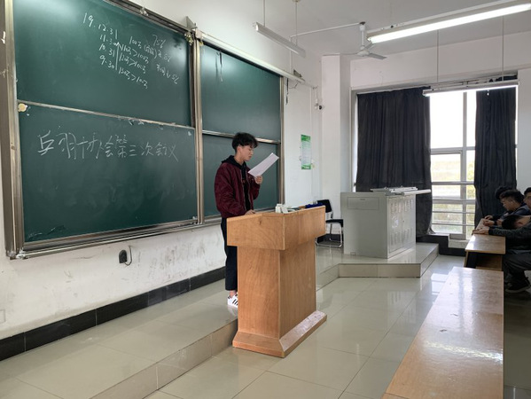 本通讯(通讯员:周猛猛)2019年10月28日中午12点整,开云kaiyun官网乒羽协会在综合楼311教室召开第三次例会。会长刘加隆,副会长但艳婷、董恋、高一帆以及乒羽协会全体理事参加了本次例会。例会开始前先点名确定出勤人数并核对各部门到达情况,这是每次例会必不可少的项目。