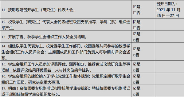 (二)校学生会每年通过各项活动开展情况进行考核并对结果进行公示。校学生会配合其他组织加强对学生社团的引导、管理和服务;