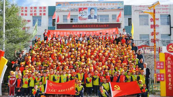 “我的梦想是当医生,给乡亲们治病!”“我的梦想是像哥哥姐姐一样,把知识带到更多地方!”现场,63名藏族孩子在“火凤凰”志愿者的带领下,进行了激情澎湃的主题演讲《手拉手 心连心共筑中国梦》,用汉语和藏语依次诉说着心中的梦想。“汉藏一家亲,共筑中国梦”的激昂誓言格外响亮,久久回荡在高原上空。