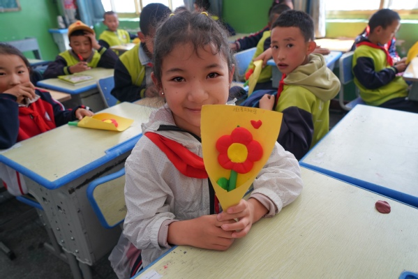图为藏族学生正在展示自己的手工作品 摄影:肖嘉禾