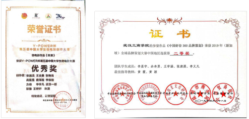 张滨淏同学在2019年全国大学生新媒体知识竞赛中获得国家级三等奖;和许潇等人编导的作品《自渡》在中国大学生微电影创作大赛中获得优秀奖;参赛作品《中国虾谷360品牌策划》在全球大学生品牌策划大赛中获得国家级二等奖。肖梦茹同学在2019年第三届全国大学生环保知识竞赛中获得优秀奖,制作的《毕业季MV之再见再见》荣获第八届“视友杯”中国高校电视奖综艺类三等奖。