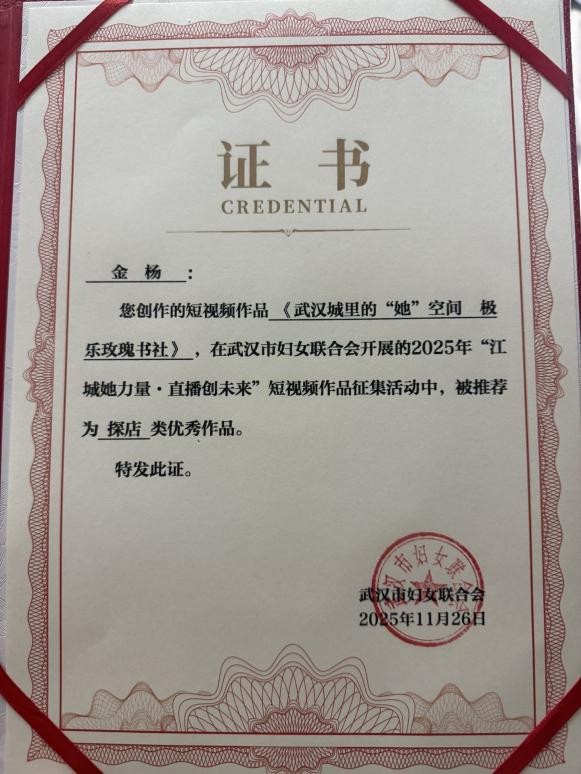 金杨小组(组长:金扬,组员:孙佳宝,贾雅雯,姜璇,邱爽)作品《武汉城里的“她”空间—极乐玫瑰书社》以独特的女性视角、细腻的情感表达和富有创意的影像语言,生动形象的描述了当代年轻人怀揣理想,独立创业的故事。充分体现了创业过程中的艰辛,但却同时也体现了年轻人百折不挠的坚韧意志。另一方面,视频也讲述了对顾客的人文关怀,体现了温暖包容的大爱精神。