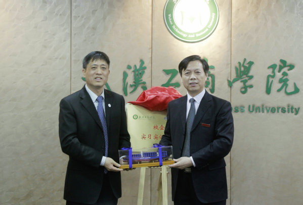 图为张安富校长与武汉苏宁人资总监喻时运共同为订单班揭牌