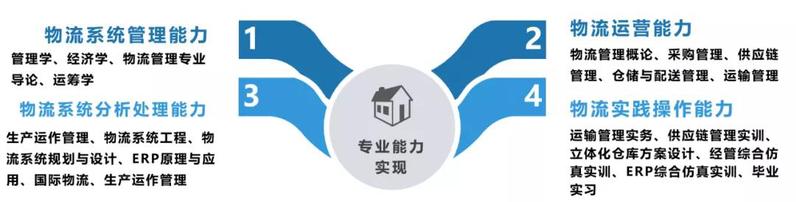 核心课程:物流管理概论、物流系统工程、供应链管理、采购管理、生产运作管理、ERP原理与应用、仓储与配送管理、物流系统规划与设计等,专业能力实现矩阵如图所示。
