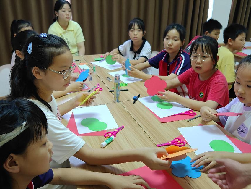 课上,志愿者们先是给小朋友讲述了蒲团荷花的由来、特性等知识,后播放一段剪纸教学视频,并拿出五颜六色的彩绘纸和手工教具,小朋友们眼睛里充满了欣喜和期待。提到莲的寓意,高年级的同学们反应迅速,齐声喊出《爱莲说》中的名句“出淤泥而不染,濯清涟而不妖”。由“莲”入“廉”,莲花之清廉正洁,被小朋友们深深地记在心上。