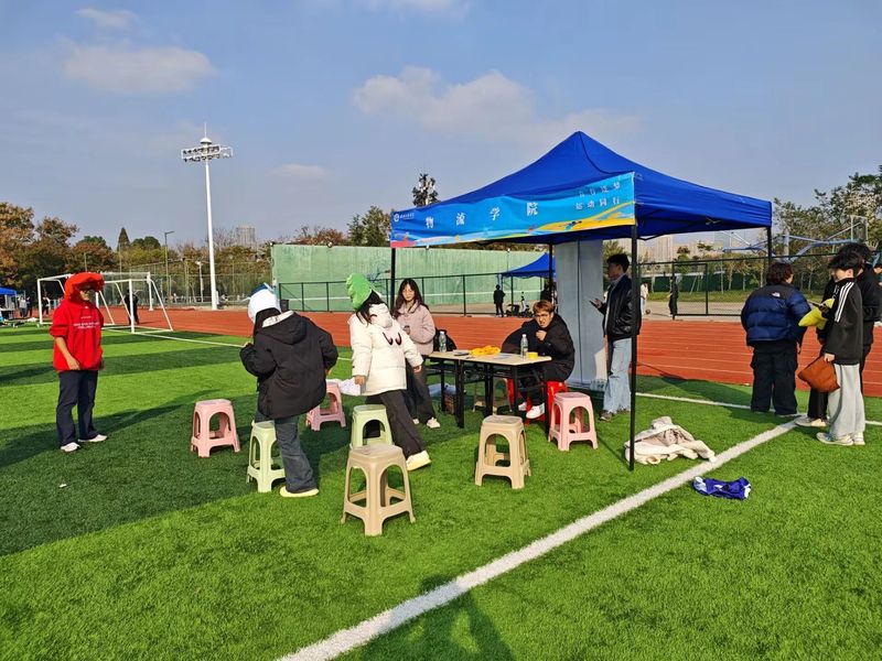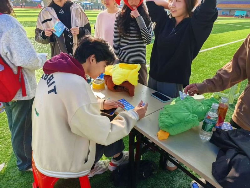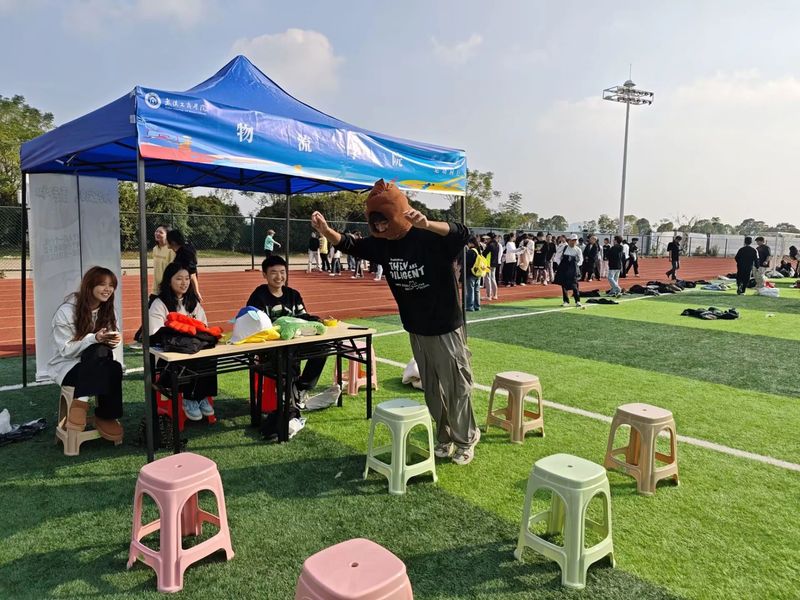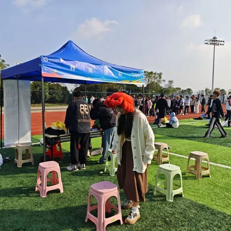 活动在操场上精彩上演,现场布置得既富有创意又充满挑战。一排多彩的椅子被精心排列成一条彩虹蹦蹦高赛道,色彩斑斓,吸引了众多师生的目光。参赛选手们身着统一的玩偶服,分为三个小组,每支队伍站在起点线上,准备开始他们的跳越彩虹冒险。
