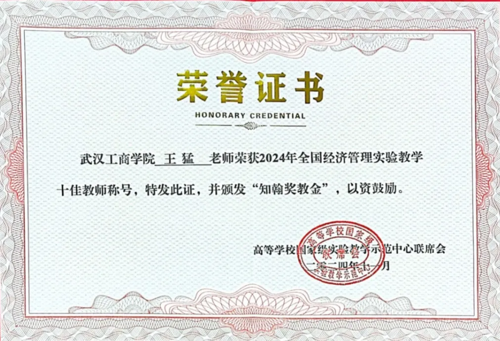 △“2024年全国经济管理实验教学十佳教师”获奖证书