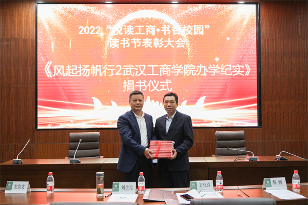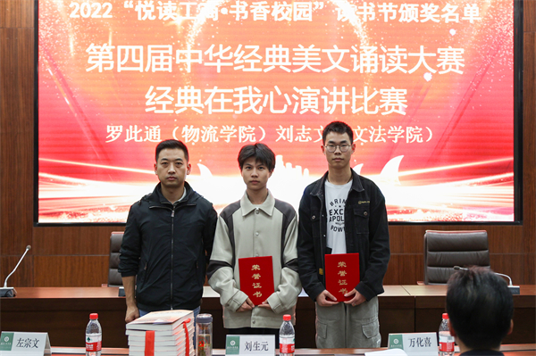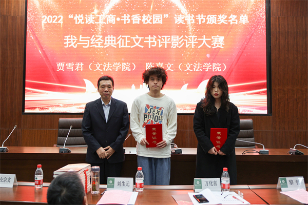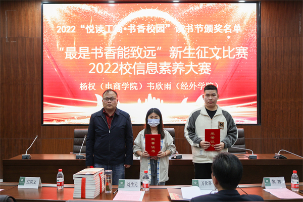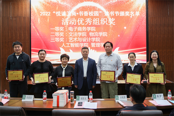 左宗文副校长宣读了2022年“悦读工商·书香校园”读书节活动优秀组织奖获奖名单:电子商务学院荣获一等奖;文法学院、物流学院荣获二等奖;艺术与设计学院、人工智能学院、管理学院荣获三等奖。刘生元书记为获奖学院颁奖。