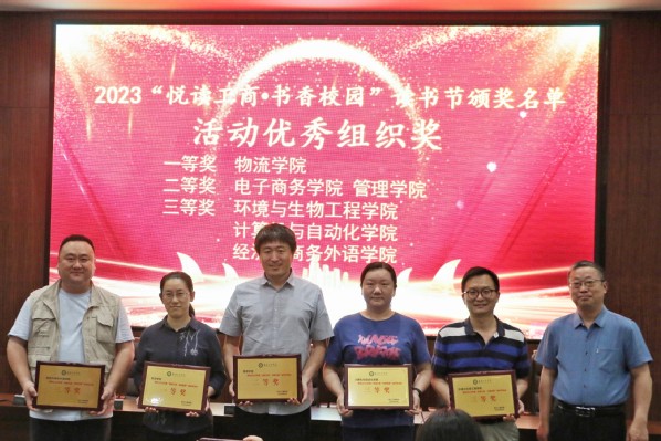 左宗文副校长宣读了2023年“悦读工商·书香校园”读书节活动优秀组织奖获奖名单:物流学院荣获一等奖;电子商务学院、管理学院荣获二等奖;环境与生物工程学院、计算机与自动化学院、经济与商务外语学院荣获三等奖,并为获奖学院党总支书记颁奖。