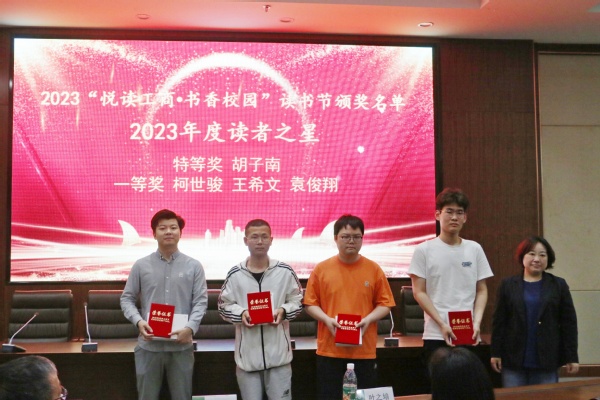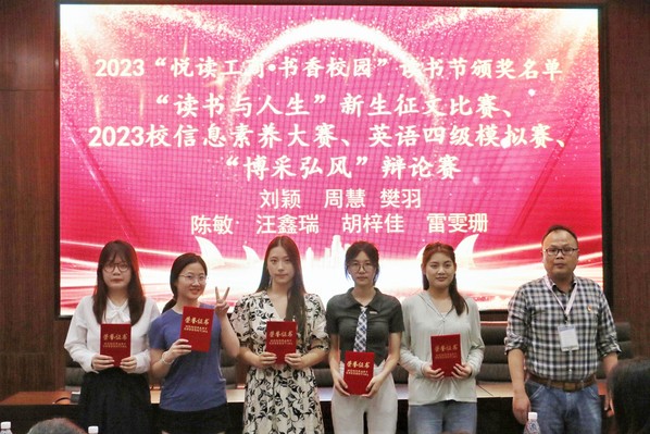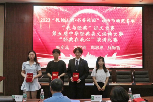 在学生颁奖环节,与会领导分别为“2023年度读者之星”、“我与经典”征文大赛、第五届中华经典美文诵读大赛、“经典在我心”演讲比赛、“博采弘风”辩论赛、“读书与人生”新生征文比赛、2023武工商信息素养大赛、英语四级模拟赛等比赛的获奖学生颁奖。