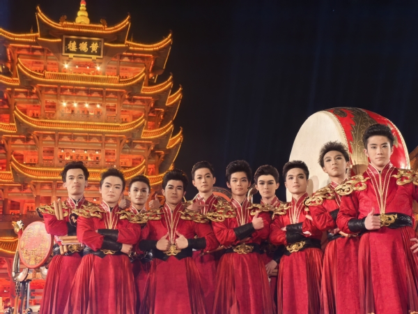 图为武工商学子在央视春晚武汉分会场主题节目《星汉耀江城》鼓阵表演录制现场合影
