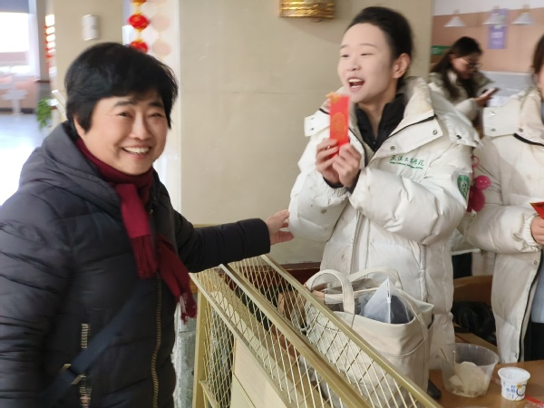 图为副校长桂裕清、总会计师王程军,艺术与设计学院院长许开强、党总支书记罗筱芳为师生们发放新年红包