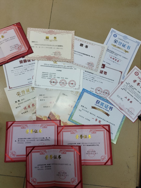 图为张暄所获部分荣誉证书
