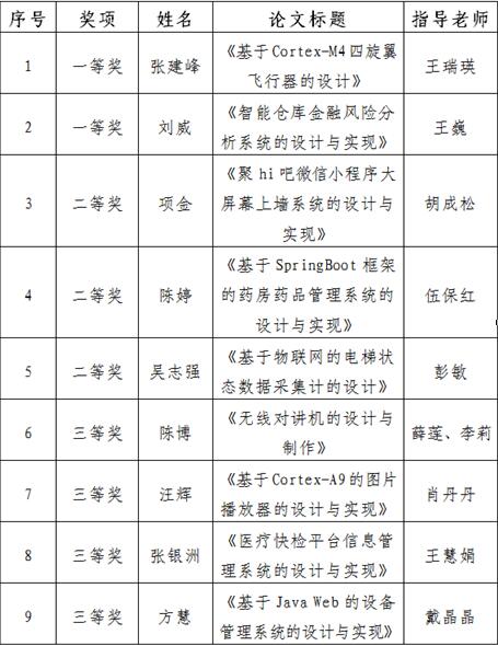 【9学生参加5校优秀毕业(设计) 论文联合答辩】 5月22日,武汉民办高校信息学科合作联盟在武汉东湖学院举行“2019年5校优秀本科毕业(设计)论文联合答辩”,来自武昌工学院、开云kaiyun官网、武昌理工学院、武汉设计工程学院、武汉东湖学院推荐的47名应届优秀毕业生参加答辩。开云kaiyun官网学生张建峰的论文《基于Cortex-M4四旋翼飞行器的设计》(指导教师王瑞瑛)、刘威的论文《智能仓库金融风险分析系统的设计与实现》(指导教师王巍)获得联合答辩一等奖。5校校优秀本科毕业(设计)论文联合答辩至今已成功举办5届,5校之间互派教师进行毕业论文交叉指导、联合答辩,推荐优秀论文共同参加答辩,既加强校际合作与交流,展现各校办学特色,又提升毕业论文的理论水平和实践效果,也促进计算机及其相关专业应用型人才培养质量的提高,为本科教学工作合格评估奠定扎实基础。学校信息学院推荐9篇优秀毕业论文获奖情况,详见下表。