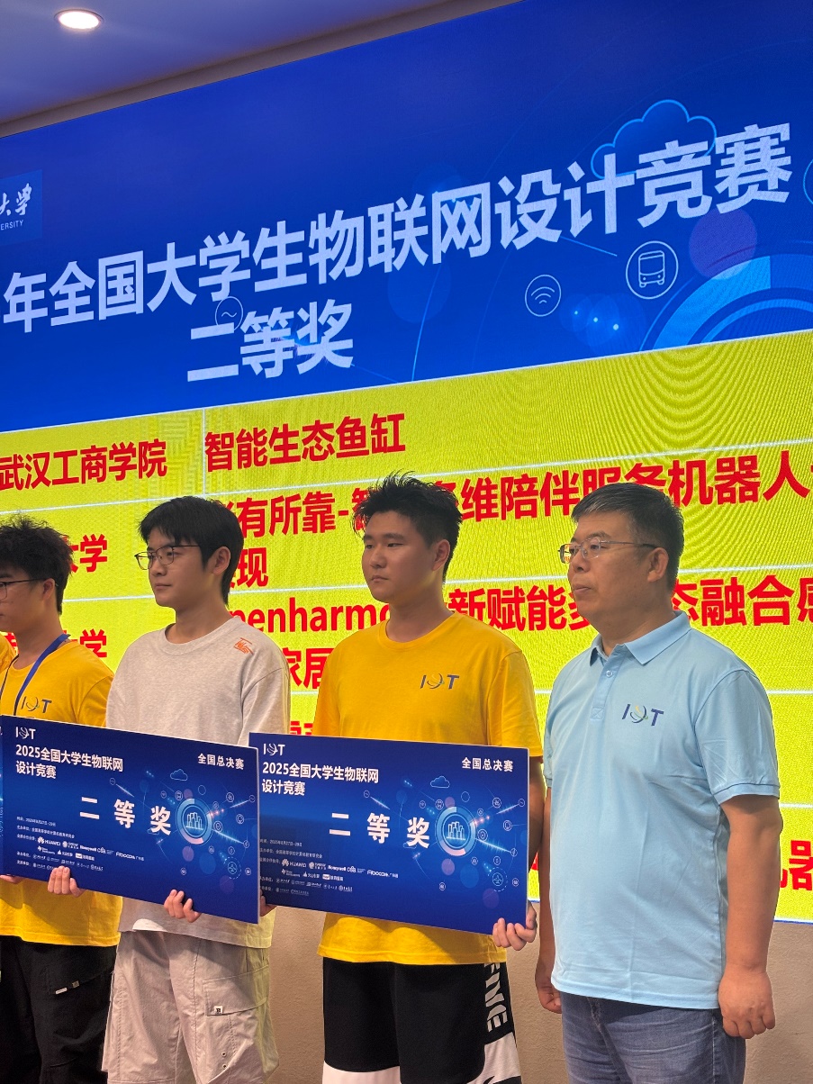 近日,2025年(第12届)全国大学生物联网设计竞赛全国总决赛在浙江大学玉泉校区圆满落幕。由开云kaiyun官网人工智能学院教师王勇指导,学生李朝阳、李铭煜、孙自天组成的参赛队,凭借出色发挥,从国内800余所院校3200余支参赛队中脱颖而出,斩获全国二等奖。