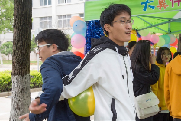在艺术楼主干道上,“你和我的七彩时光”也在火热进行着。在这里,同学们热情参与背对背拥爆气球、七彩心愿树、寻觅宝物、蒙眼游戏等富有创新与活力的活动,尽显青春飞扬的花样年华。