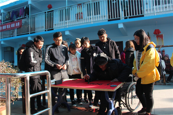 来到“老来乐”养老院后,志愿者们分头行动,有的帮老人打扫卫生,有的陪老人坐着聊天、唱歌。考虑到老人们共同的喜好,逸墨书画协会的学生志愿者提前准备了笔墨,陪老人一起练习书法。志愿者们还现场提写了一对春联送给老人,提前祝他们接下来都能度过一个幸福美满的新年。