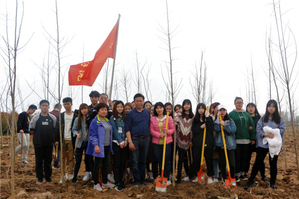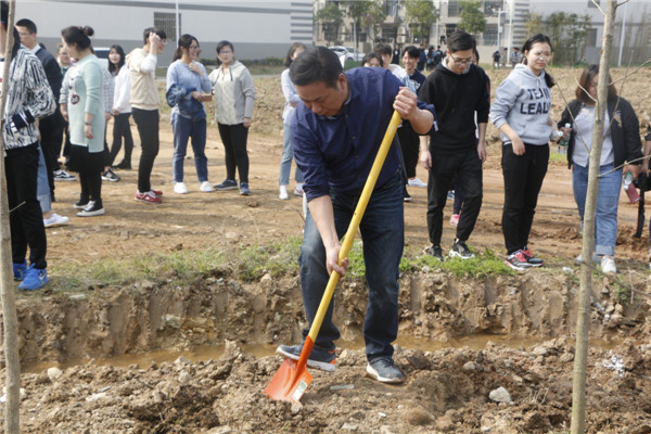 下午14:00,在校党委书记陈伟的带领下,教职工代表和学生代表等一行人高举旗帜、扛着锄头,在学校二期空地、综合楼、实验楼、图书馆、静思湖和学生公寓等周边植树。