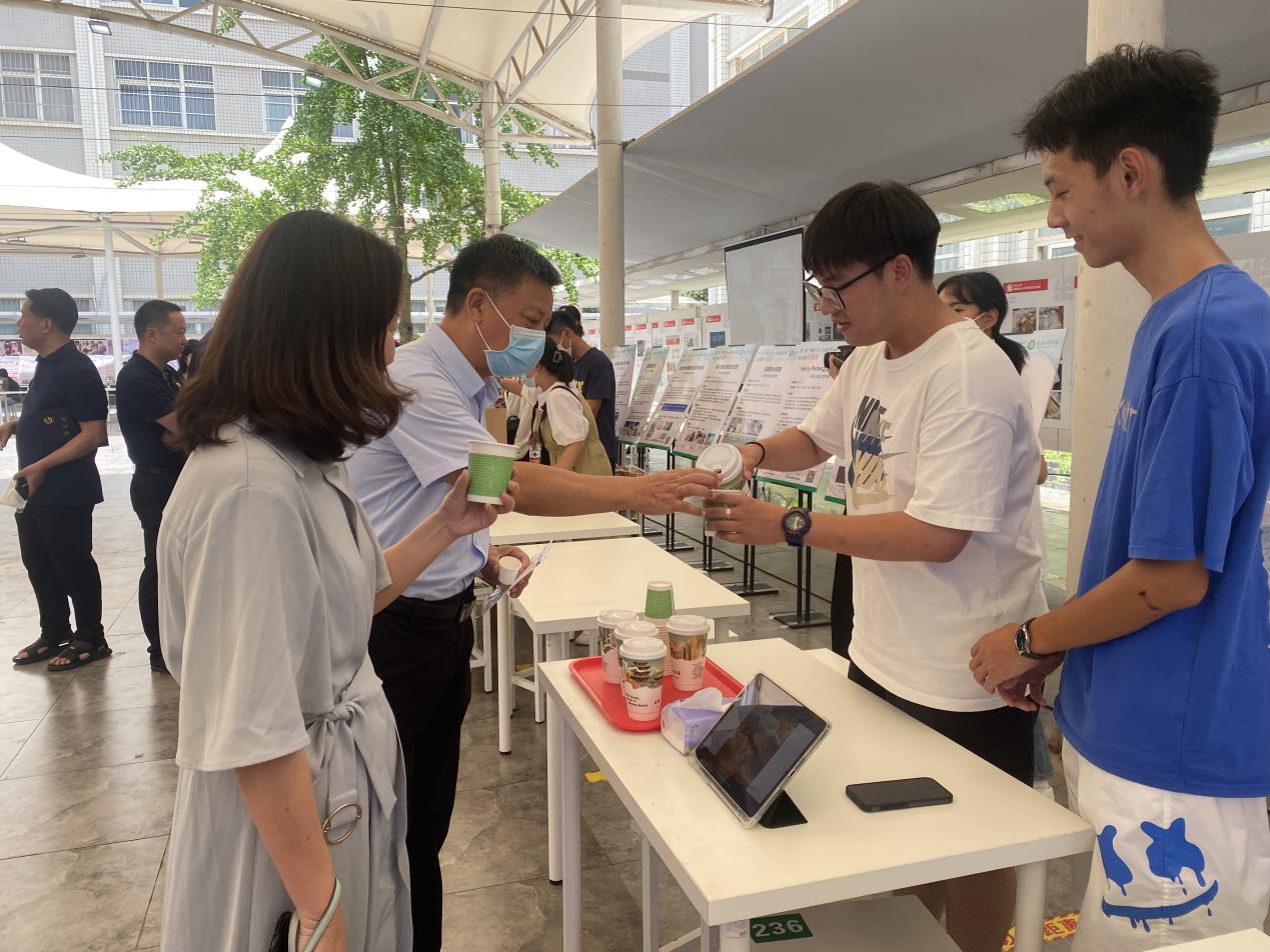 活动现场,不仅有很多学生来品尝,还受到了校长孔建益的关注,孔建益校长向项目负责则人询问了在项目的基本情况,与团队的未来规划。在经过一番交流后孔建益校长还为“一盏斛”投上了宝贵的一票。