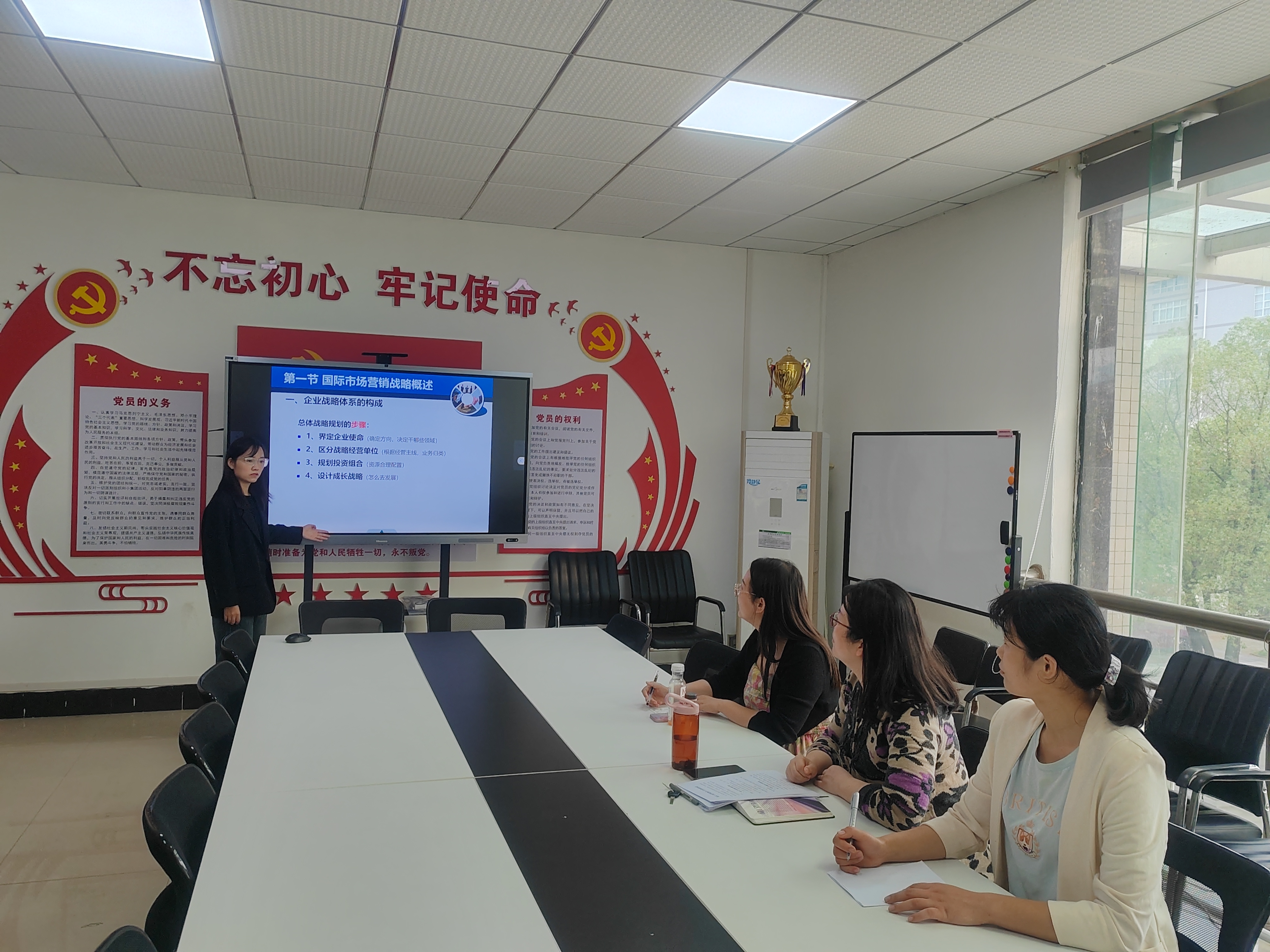 会上,青年教师王敏以《国际市场营销战略》为题,进行了说课及现场授课展示。展示过后,副院长熊晓亮教授从“设计”“积累”“学习”三个方面与青年教师就教学设计的整体结构、课程创新要素、师生互动等方面进行了心得体会的交流和沟通。她强调,青年教师要充分备课,综合准备多种参考教材和书籍,整合形成完整的、结构化的知识体系,提前撰写课堂讲稿,对授课内容完全熟悉,这样才能够更好地把握课堂的节奏。