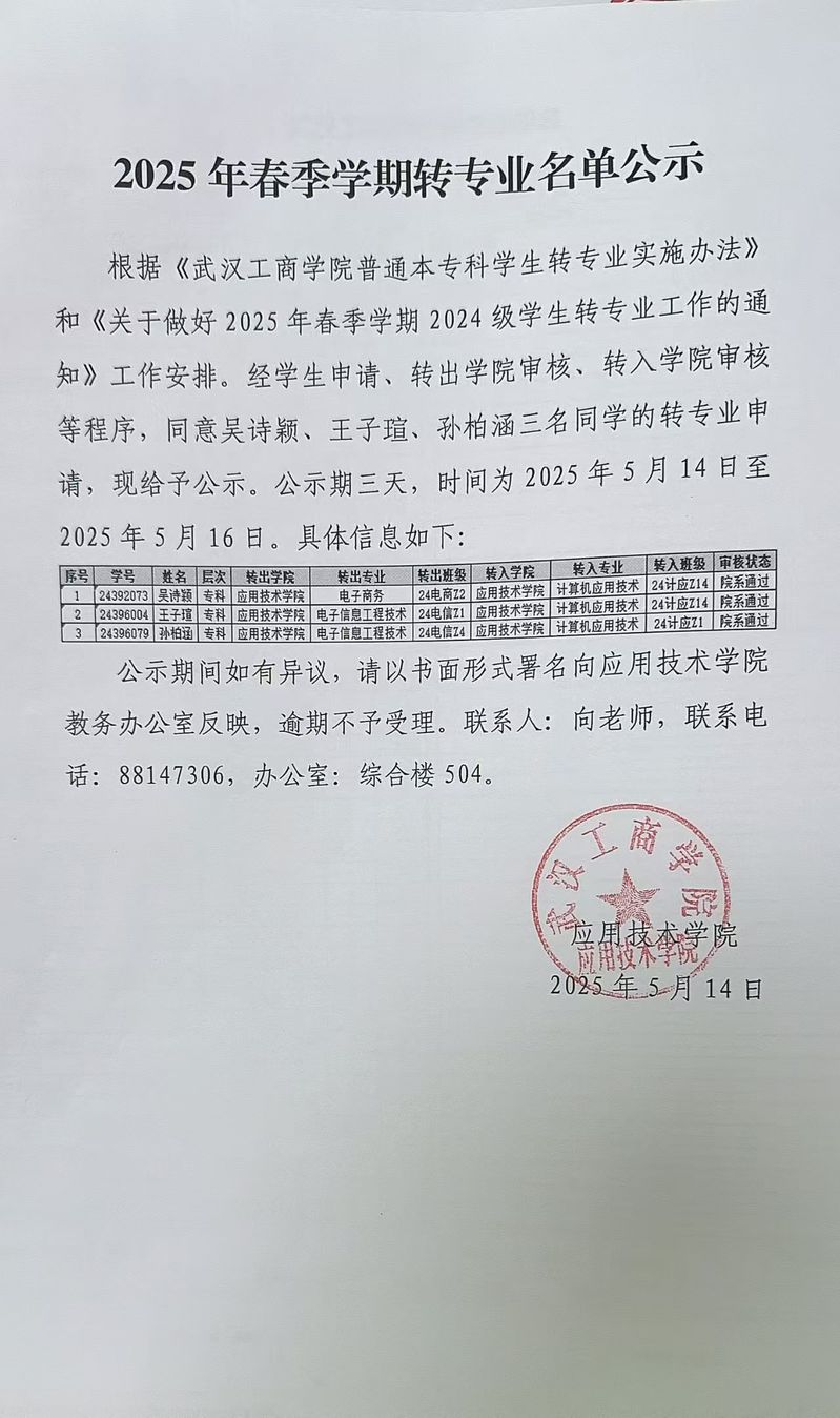 2025年春季学期转专业名单公示