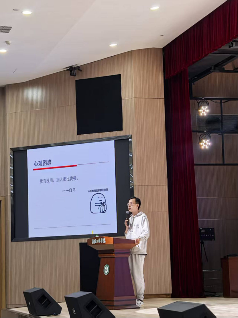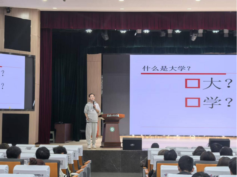 “什么是大学?是‘大’的校园,还是‘学’的追求?” 宣讲一开始,朱威书记便以一个深刻的问题引发同学们思考。他敏锐地察觉到新生们初入校园可能面临的心理困惑 —— 对新环境的失落、远离家乡的怀旧、对比他人的自卑、平衡生活的焦虑、无所适从的空虚、迷失方向的迷茫,这些情绪被他一一提及,也让同学们感受到了来自学院的理解与关怀。