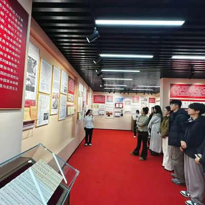 展览现场,师生党员们跟随讲解员有序参观,认真端详泛黄的早期译本、手稿复刻件等展品,不时围绕文献背后的红色故事交流探讨。